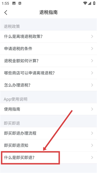 3、在退税指南页面点击【什么是即买即退?】,可查看其详细说明。