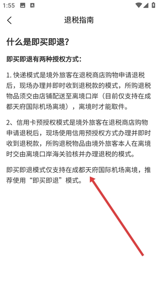 4、进入【什么是即买即退?】详情页,可了解到即买即退的两种授权方式及适用的离境口岸等信息。
