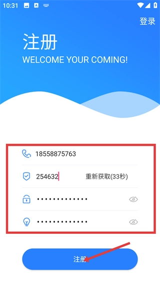 3、在注册页面,填写手机号、验证码、密码等信息后,点击【注册】,完成账号注册。