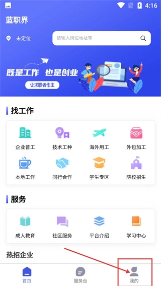 1、打开【蓝职界】的首页后,点击页面底部的【我的】选项,即可进入用于管理个人求职信息的个人中心页面。