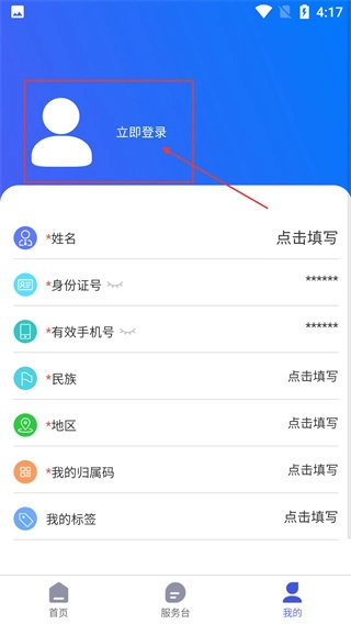 2、在个人中心页面,点击【立即登录】区域,进入登录流程,该页面需填写姓名、身份证号等求职相关信息。