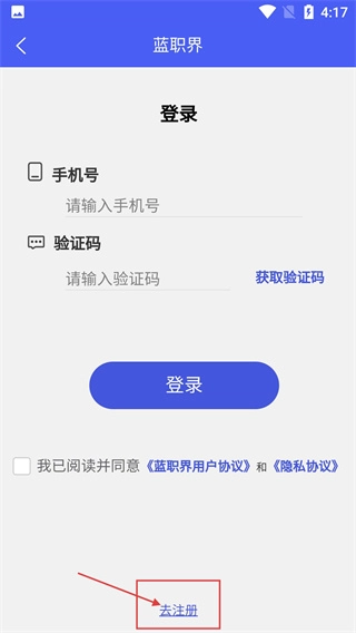 3、进入登录页面后,点击底部【去注册】按钮,可切换至新用户注册流程,支持通过手机号+验证码+归属码完成注册。