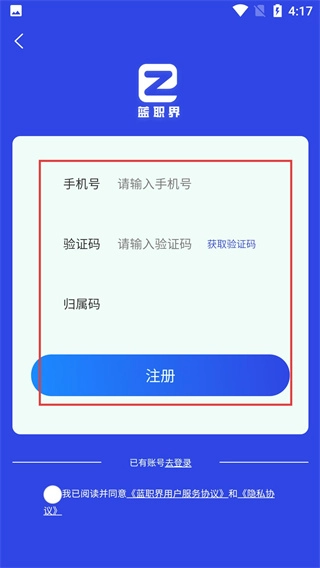 4、在注册页面,输入【手机号】并获取验证码,填写【归属码】后,点击【注册】即可完成账号创建。
