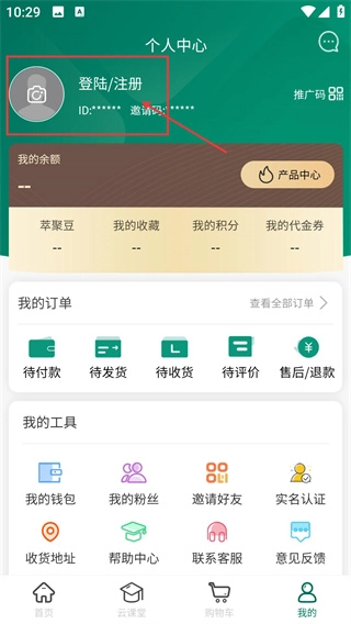 2、在个人中心界面,点击【登陆/注册】区域,可进入登录注册界面。