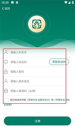 4、在注册界面,依次填写手机号、验证码、密码、真实姓名、邀请码,点击【注册】,即可完成注册。