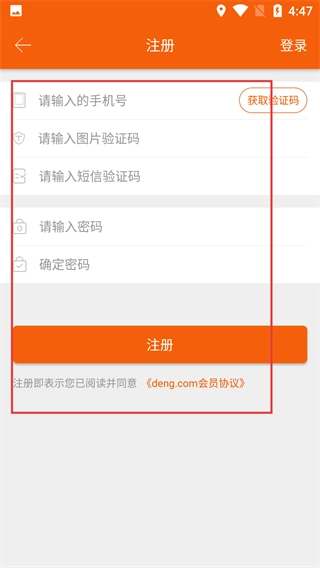 4、在注册界面,依次输入【手机号】、图片验证码、短信验证码、设置密码并确认,点击【注册】按钮完成注册。