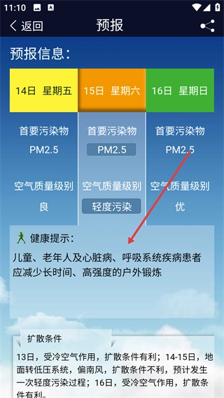 4、查看该日期的首要污染物、空气质量级别及健康提示,完成空气质量预报查询操作。