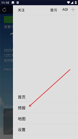 在空气质量页面,滑动屏幕即可调出功能菜单。