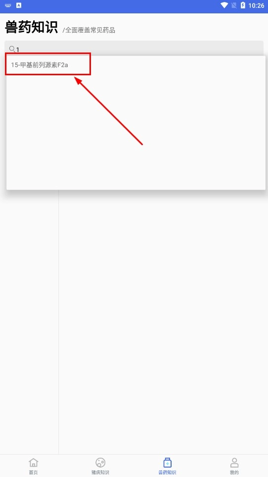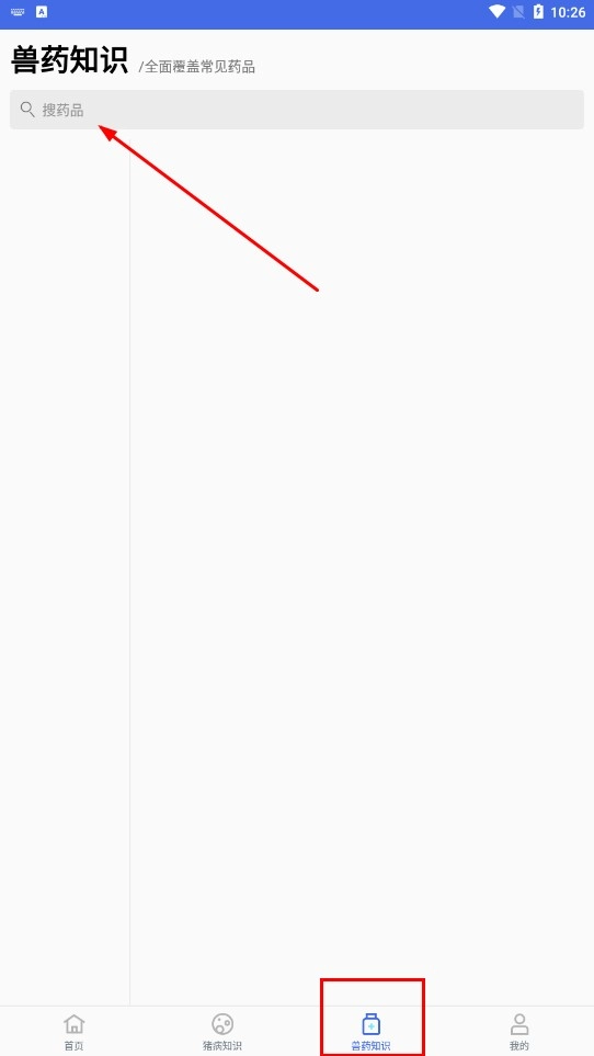3、点击底部【兽药知识-功能按钮】,进入兽药知识页面,使用【搜药品-搜索框】查找兽药。