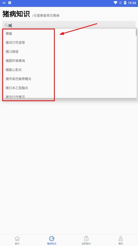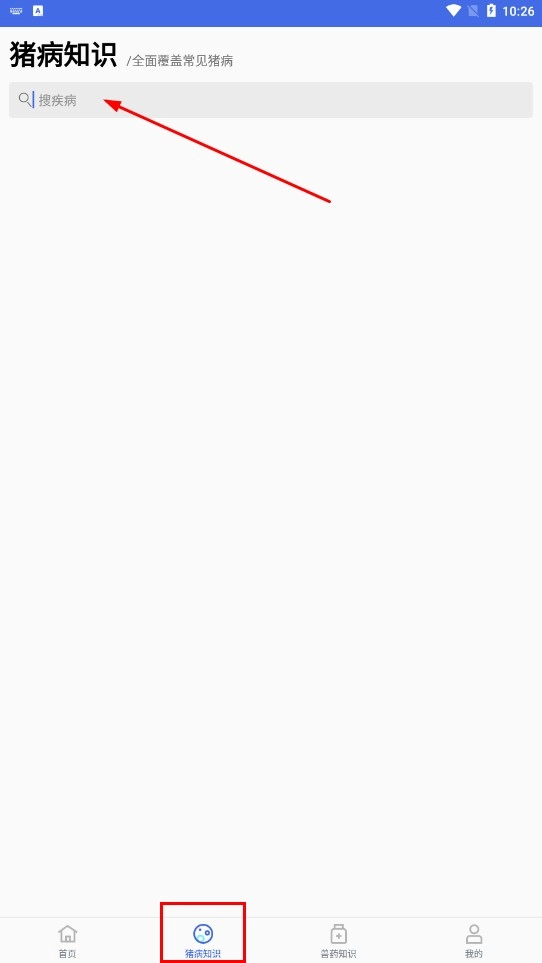 1、点击底部的【猪病知识】功能按钮,进入猪病知识页面后,通过【搜疾病】搜索框来查找相关猪病。